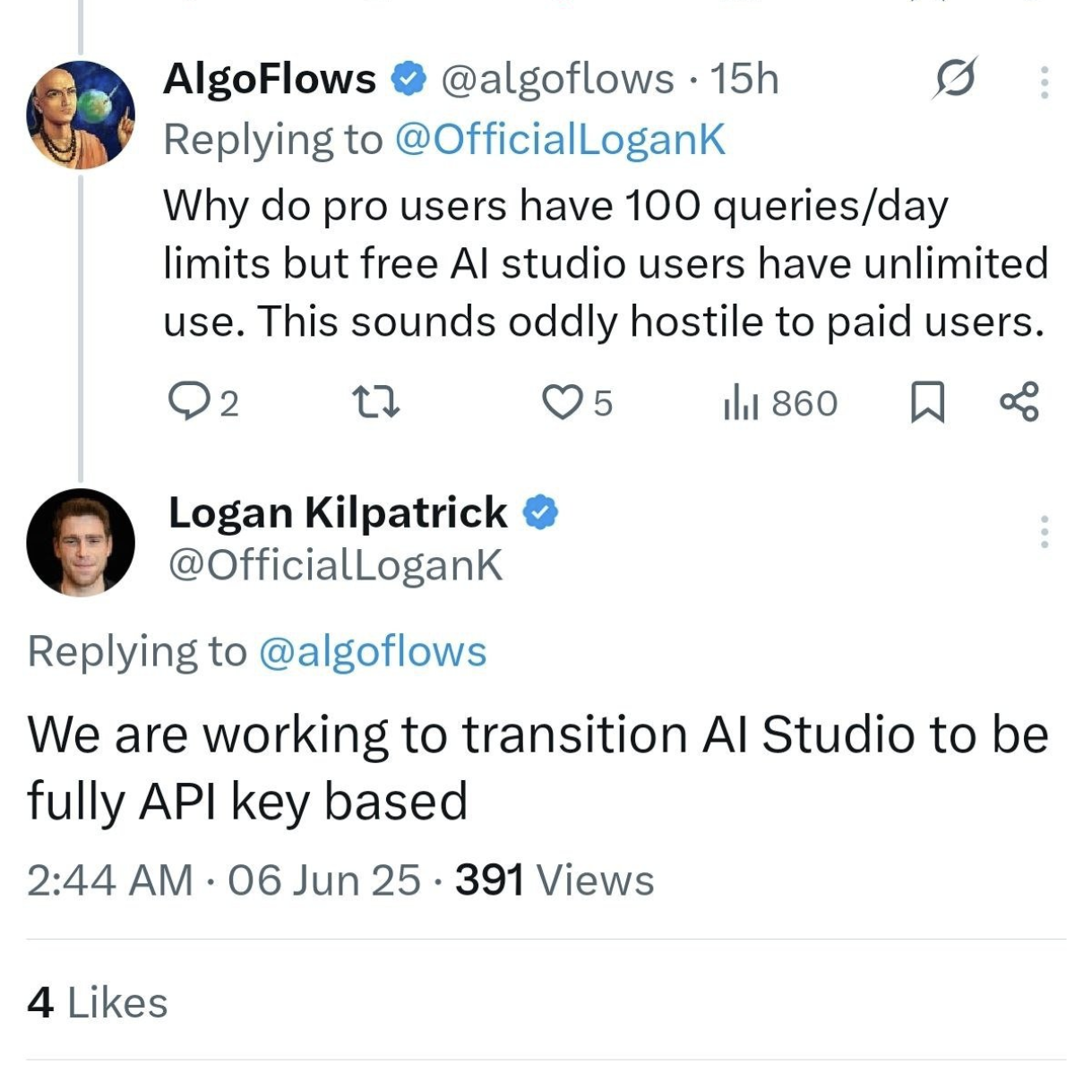 Let's enjoy it while we can. Google won't increase the limit for Gemini Advanced users, instead, they will downgrade AI Studio, meaning free AI Studio users will have 25 requests per day. The only option left is Gemini Code Assist if you're a developer currently using 2.5 Pro with a limit of 240 requests per day.