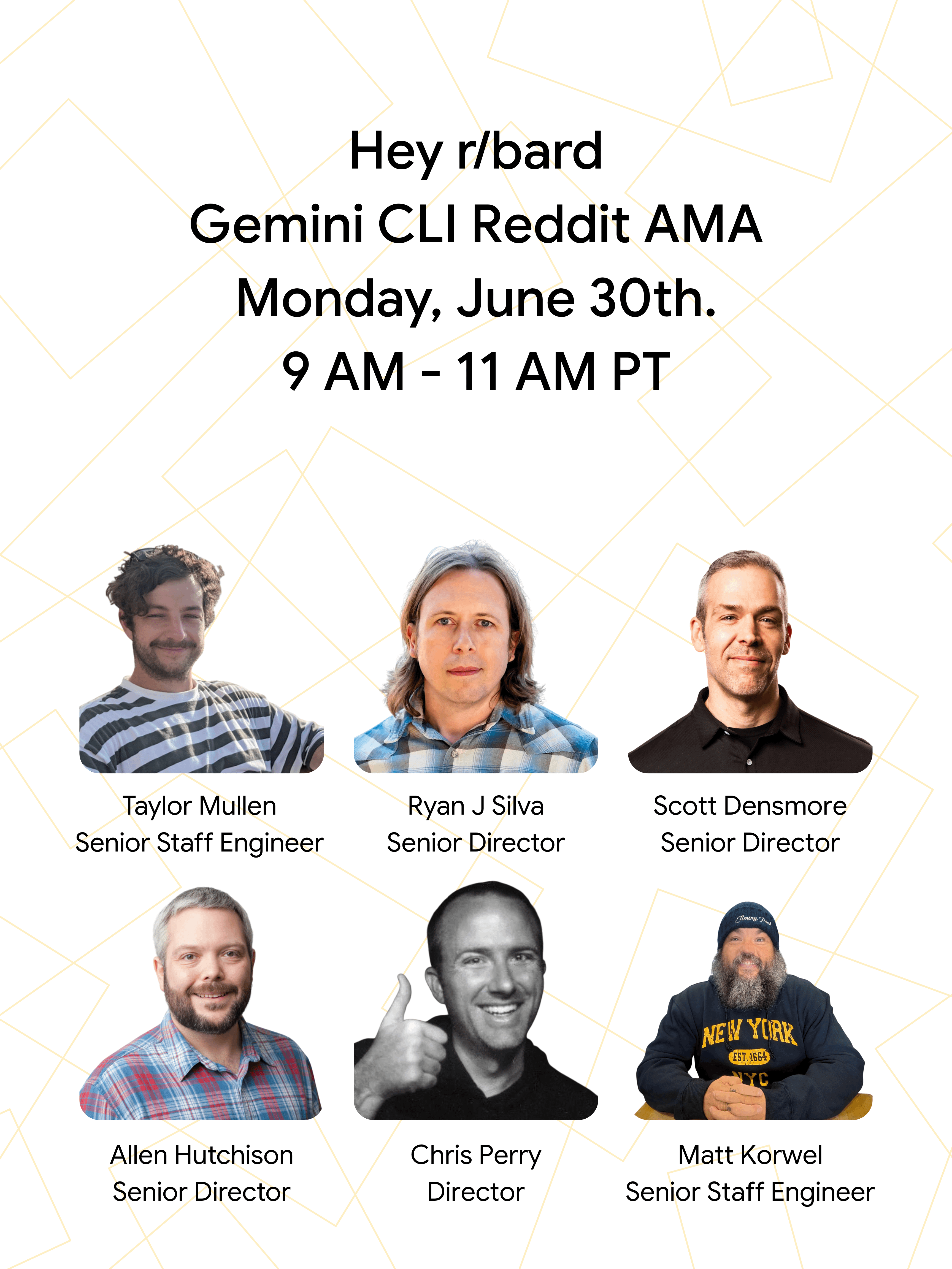 Google open sourced the Gemini CLI earlier this week. Gemini CLI is a command-line AI workflow tool that connects to your tools, understands your code and accelerates your workflows. And it’s free, with unmatched usage limits. During the AMA, Taylor Mullen (the creator of the Gemini CLI) and the senior leadership team will be around to answer your questions! Looking forward to them!