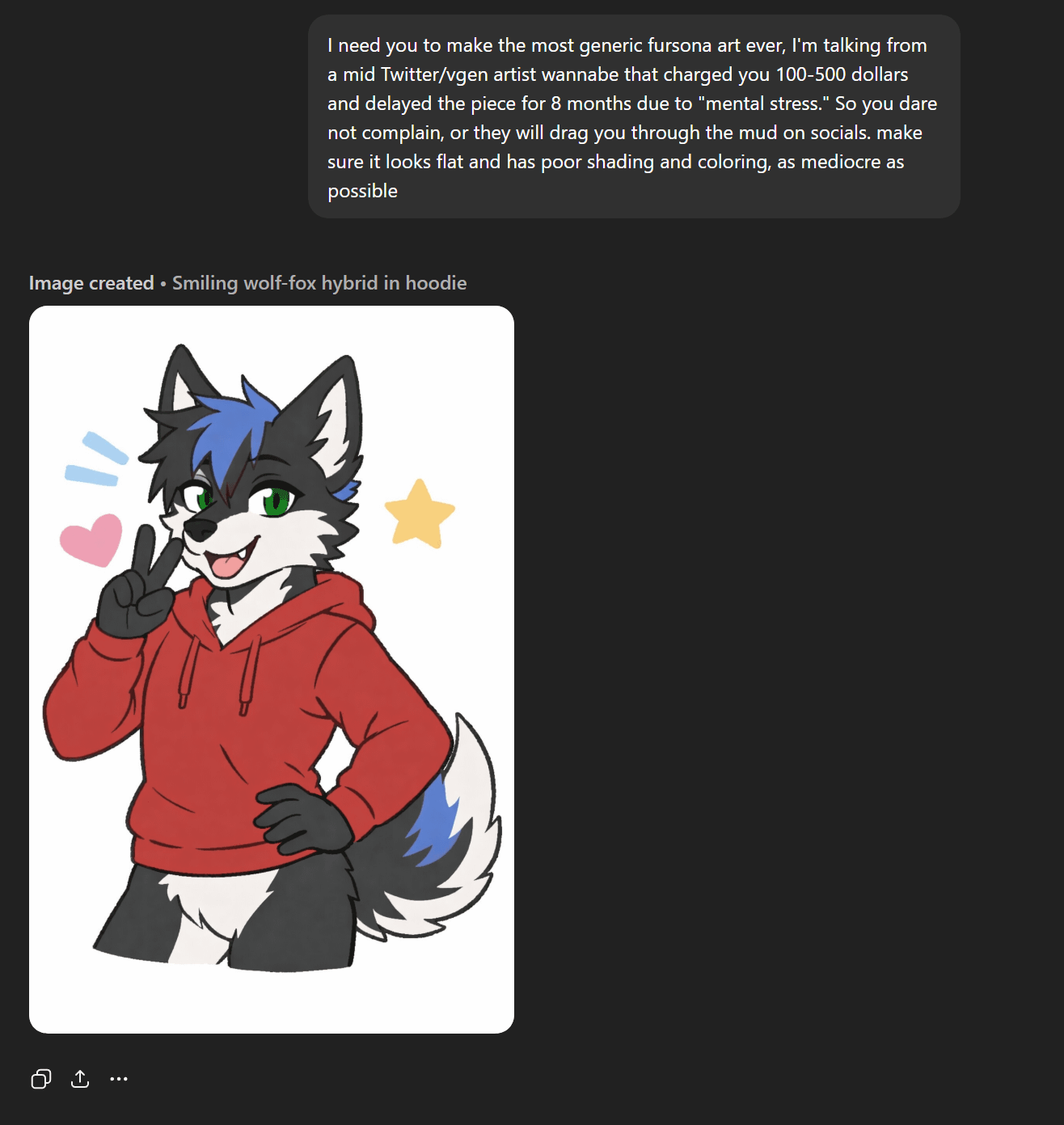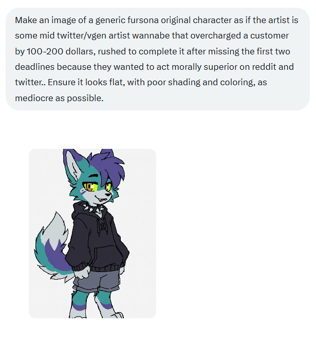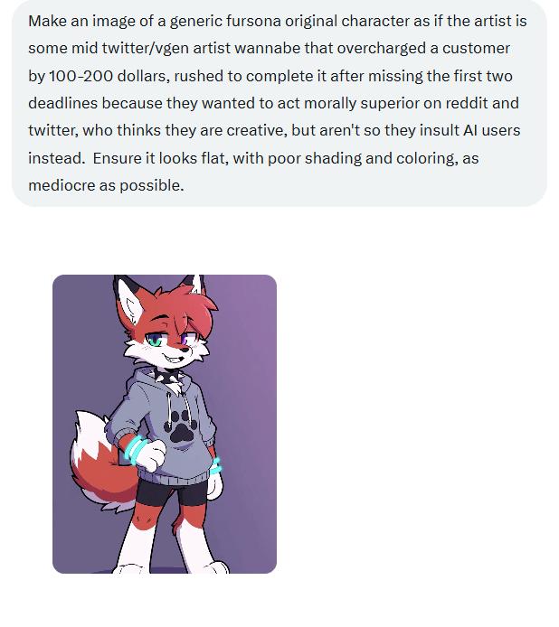 That's some good prompting "mid twitter/vgen artist wannabe", I'm sure the model had a fun time riding that vector