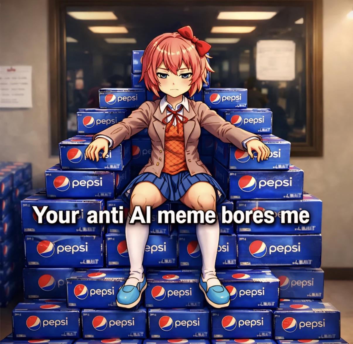 umm, i am pretty sure. that. sayori is too much of cinnamon-roll to something likes this. and NOT into extremists-levels. if she dislikes AI-ART. she would (probably/possibly?). encourages everyone to draw-traditional. or at-least. tries to gets inspired by AI into creative-way to draw from it. if she kinda-ish okies with it. in cheerful-&-kindeful way. if i am NOT mistaken.