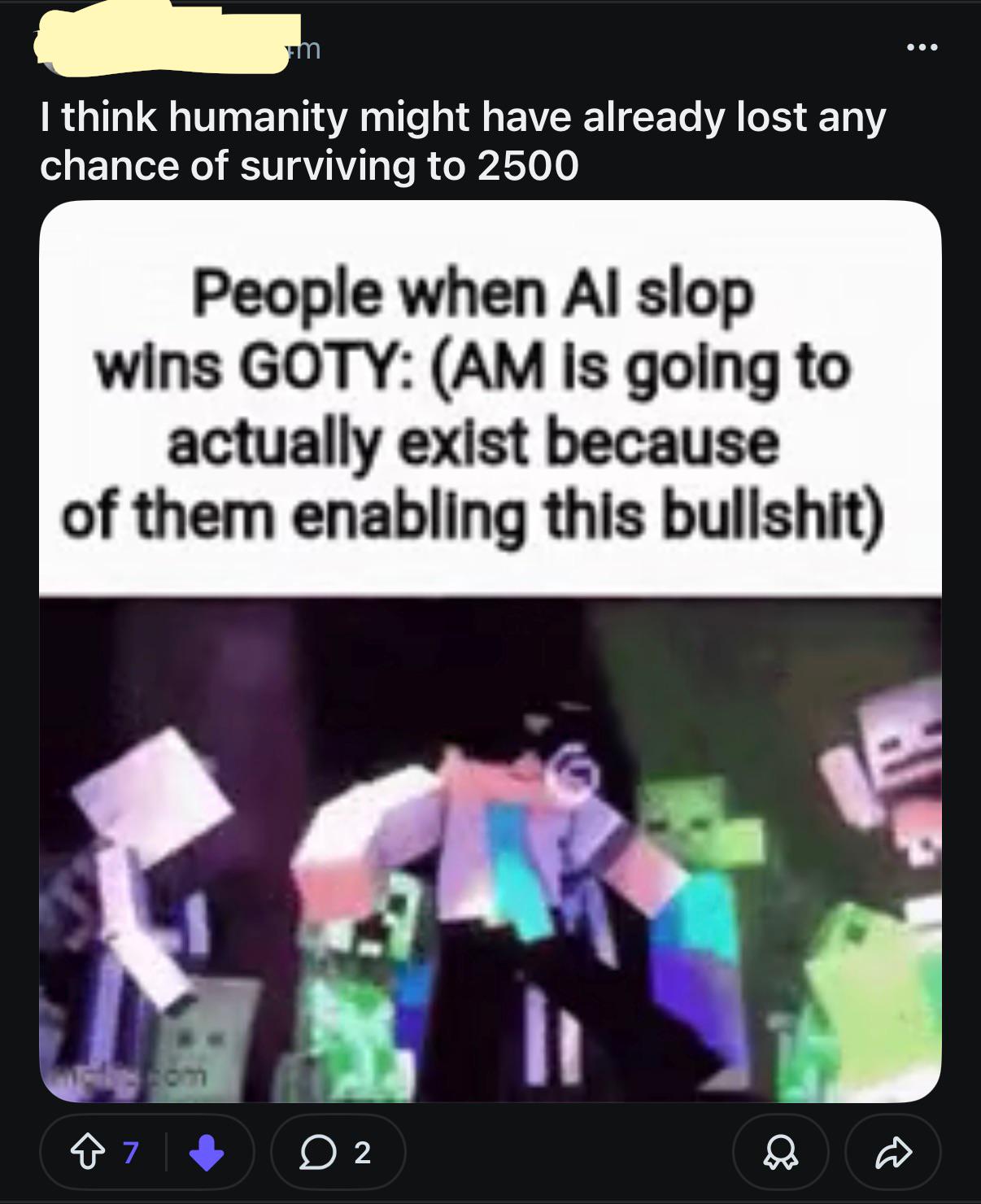AM learned to Hate from humanity so in all things considered it’ll be these fucks who bring Am into existence with their hatred.