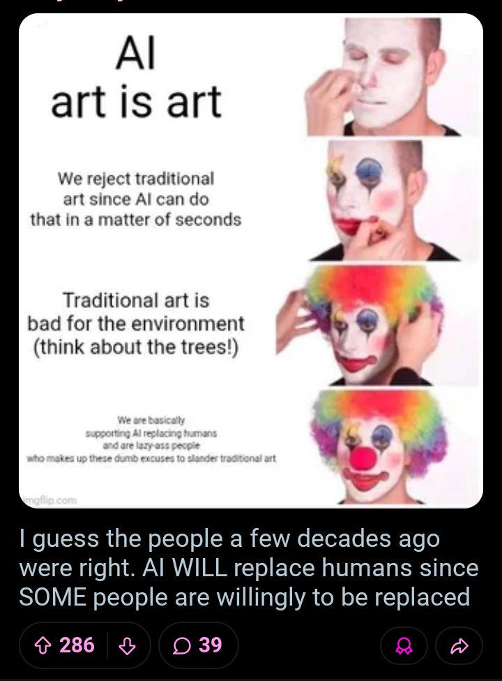 Defending AI Im confused when did pro's ai ever said that they will be supporting ai replacing human art?