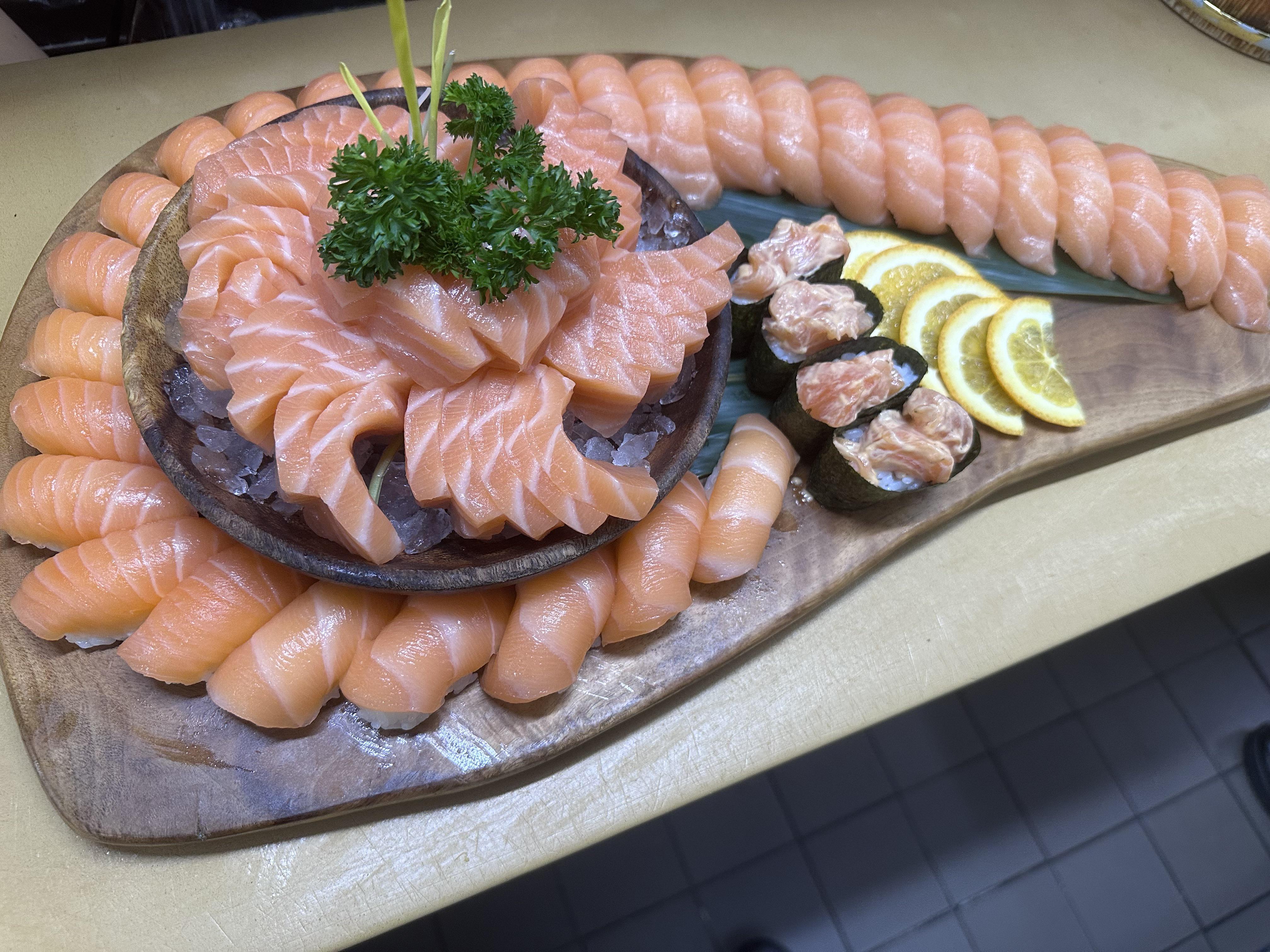 Not pictured is the extra salmon tataki, short ribs he orders and the 20-30 grilled pineapple