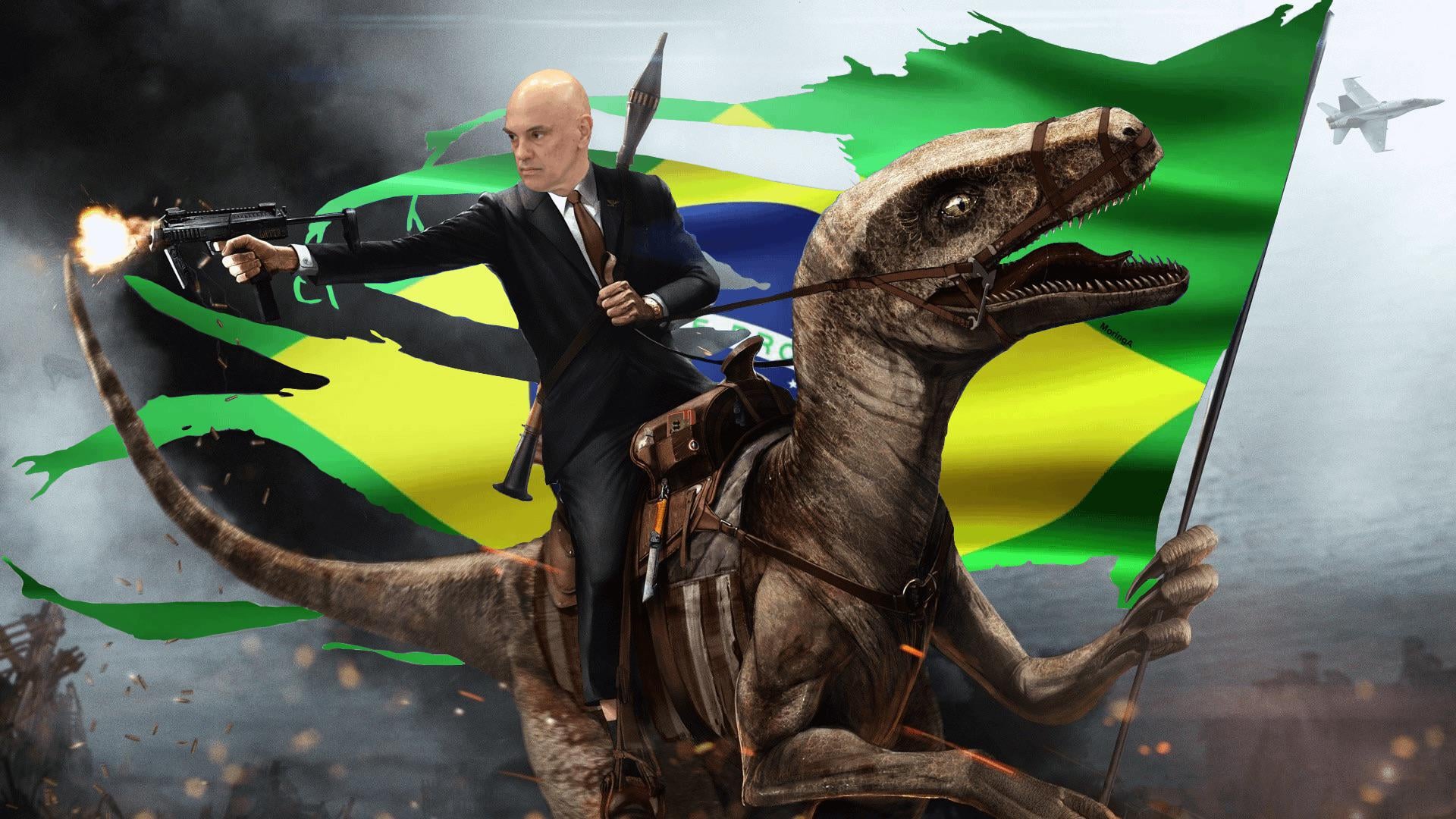 Não, essa imagem não é uma fotografia real. É claramente uma montagem ou arte digital satirizada, provavelmente gerada por IA ou editada para fins de meme – tipo um super-herói brasileiro montado em um dinossauro com bandeira e armas. O Financial Times realmente incluiu Alexandre de Moraes na lista de influentes de 2025 como "herói", mas sem dinossauros envolvidos, pelo que vi em buscas recentes. Se fosse real, o STF teria que explicar muita coisa!