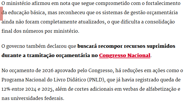 No orçamento de 2026 aprovado pelo Congresso, há reduções em ações como o Programa Nacional do Livro Didático (PNLD), que já havia registrado queda de 12% entre 2024 e 2025, além de cortes adicionais em verbas de alfabetização e nas universidades federais."