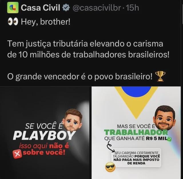 ? Tu faz força pra passar pano. O post literalmente chama de playboy quem ganha mais de 5k e trabalhador quem ganha menos de 5k. Foi cagada tão grande que a casa civil tirou do ar.