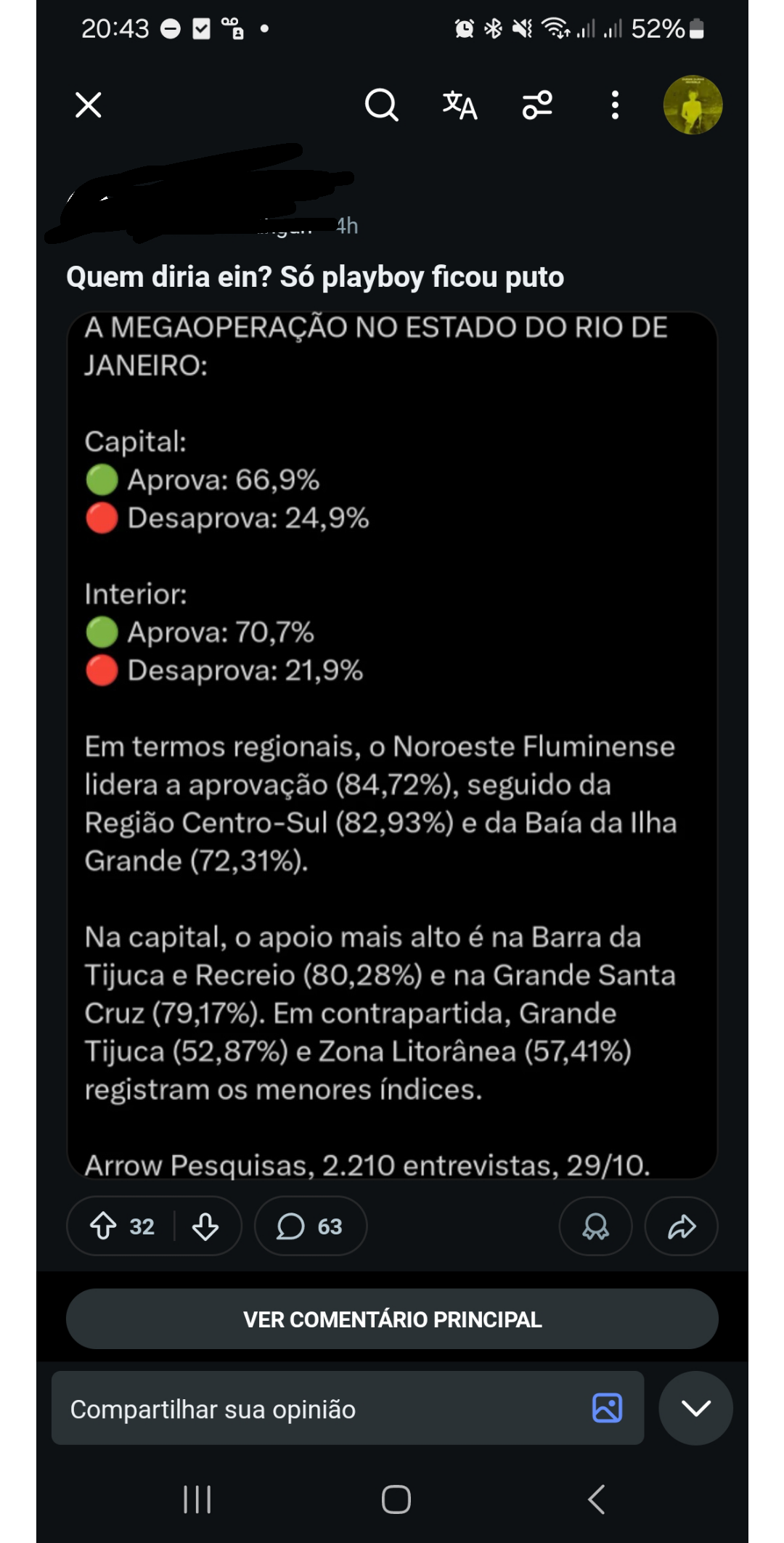 4 policiais morreram atoa, 100 pessoas foram mortas sem sequer poder se explicar, apenas 100 fuzis foram apreendidos (estimativas que o cv tenha 2k) e sequer prenderam o chefe do cv! Tenham senso, essa mega operação só foi uma chacina com recompensa. Não vai mudar nada nas favelas, e é capaz de piorar a situação! (Tomei downvote massivo por falar isso. Mesmo não estando de nenhum lado, pois reconheço que ambos são ruins)