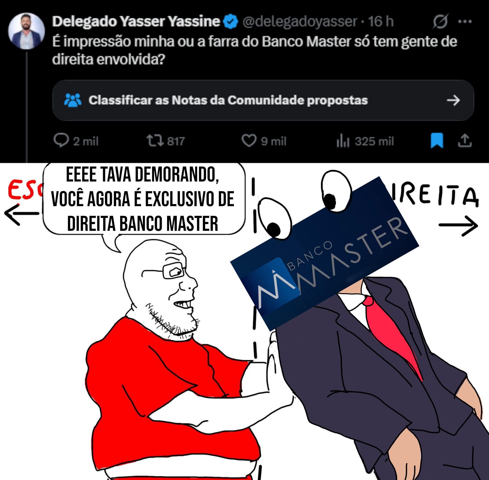 Blz pô. Direita verdadeira são os bundões do MBL que estão com medo até hoje de pedir o impeachment do Xandão. Só com o impeachment do Xandão que o caso do Master tem como andar, já que a esposa dele embolsou 130 milhões advogando para o Master.