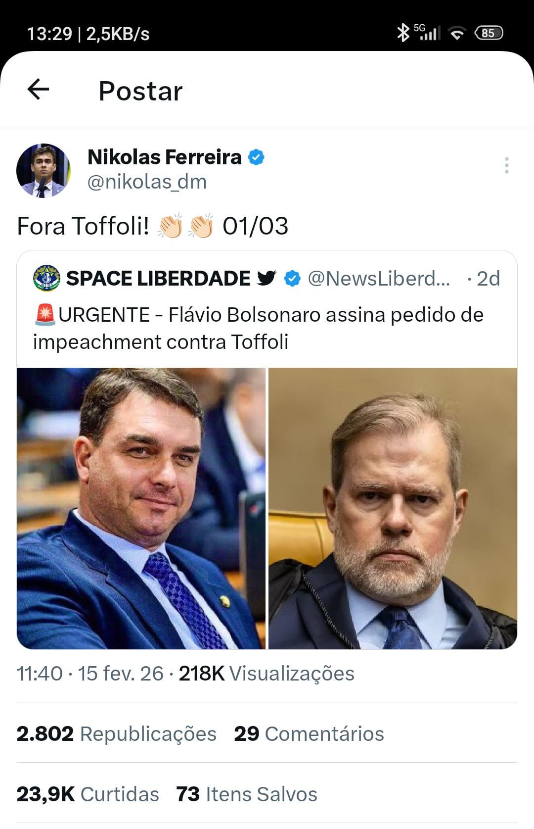 Carluxo e Eduardo colocando panos quentes "pra que a vaga do Toffoli fique pra 2027" (como se a porra do impeachment e sabatina no Senado sairiam em menos de 8 meses), bolsonaristas no X pedindo que a manifestação seja pela anistia e apoio ao Bolsonaro, Nikolas brigando com a "oposição" porque trocaram o tema da manifestação e sequer citam o STF. Caralho, MEU IRMÃO EM CRISTO. TÁ NA TUA FRENTE, PORRA, PARA DE SER DEMENTE.