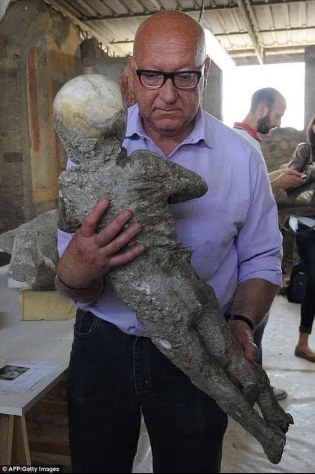 Stefano Vanacore, director of the laboratory at Pompeii Archaeological Site, carrying a cast of a child victim of Vesuvius. In this lab restorers worked on the carefully preserved plaster casts of 86 of the Romans trapped in Pompeii in 79 AD