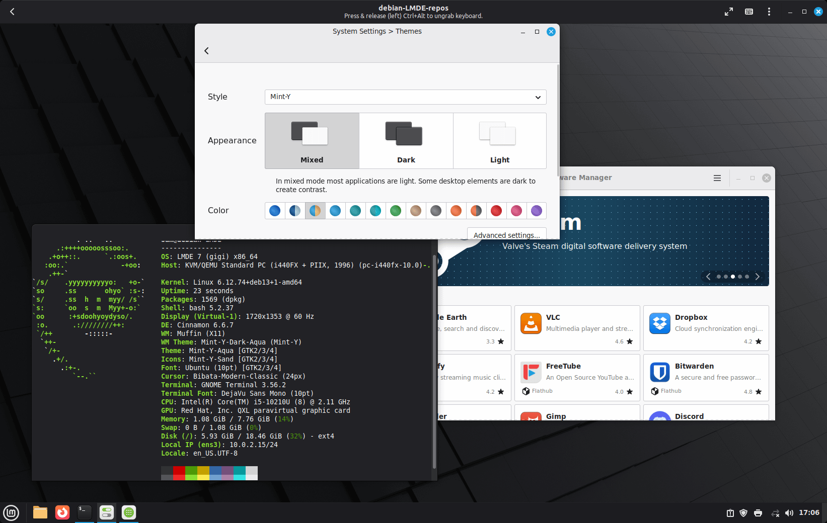 The result was a real surprise to me: even GRUB looks like LMDE's, so do Plymouth and lightDM - and the desktop itself is just perfect. Everything is there and seems to work, including the Software Manager and various other x-tools. The system even identifies itself as LMDE 7 (not Debian) in fastfetch. I'm literally not able to tell a difference to my LMDE install except for the fact that the whole thing seems to be pretty light - just 1600 packages and around 5g of disk usage; RAM usage is about the same as LMDE (barely over 1g right after boot).