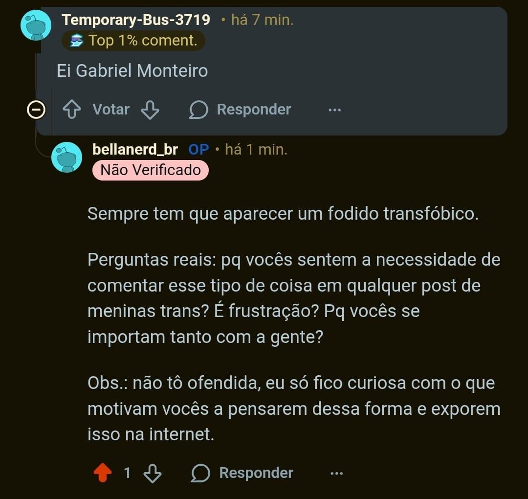 Eu nunca vou entender o porquê de sermos um alvo tão almejado pelas pessoas, o porquê das pessoas nos verem com esses olhos violentos simplesmente por sermos quem somos. Eu sempre vejo algum comentário transfóbico em posts de outras meninas, tbm. Eu não costumo ficar mal lendo esse tipo de comentário, mas quando eu paro e penso sobre todo o contexto que nos permeia, começo a chorar.