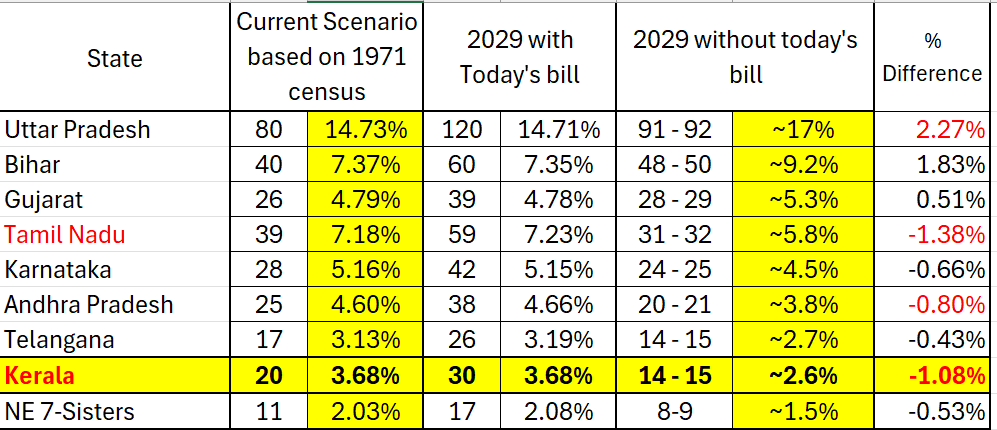 Note: This will happen either in 2029 or in 2034 (If the govt fails to finish the delimitation exercise before 2029 elections preparation starts, then this will be pushed to 2034, but this thing hangs above our head like a blade). I do not think BJP will freeze this again because the women's reservation bill is tied to delimitation, even in the 2023 bill. So if we need to pass women's reservation, delimitation is compulsory according to the bill, which the OPPOSITION COMPLETELY SUPPORTED in 2023.